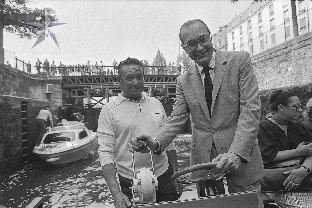 Jacque Chirac en visite sur le canal St-Martin, ici à la barre 'une flûte (petite péniche)