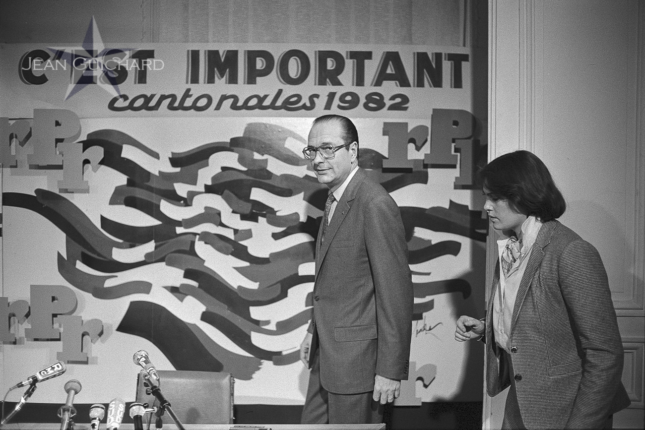 Jacques Chirac commente les résultats des cantonales 19892 au siège du RPR. Bernard Pons et Jacques Toubon
