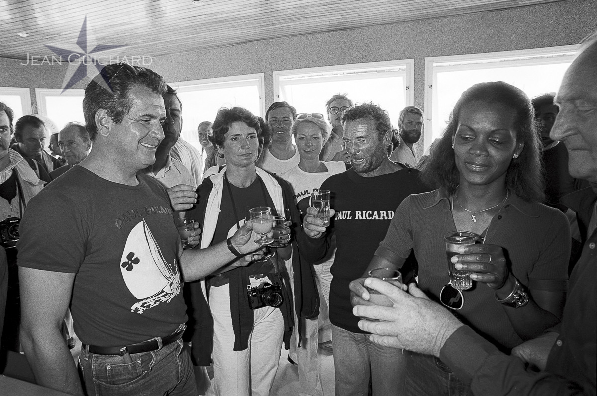 record Charlie Barr, arrivée à la Trinité-sur-mer.De gauche à droite: René Baudinet, Mme Baudinet, Eric Tabarly, Jacqueline Tabarly, Paul Ricard