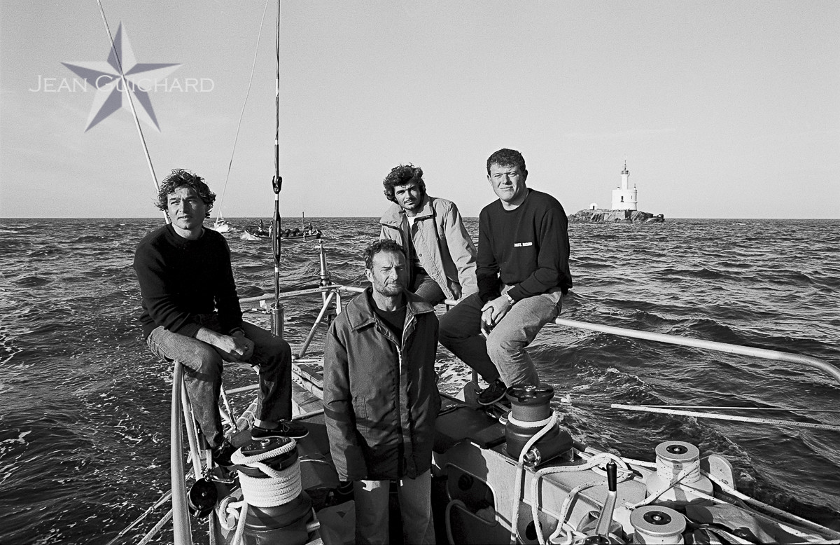 record Charlie Barr, arrivée à la Trinité-sur-mer. devant le phare de La Teignouse, de gauche à droite, George Calvet, Eric Tabarly, Dominique Pipa, George Bourhis.