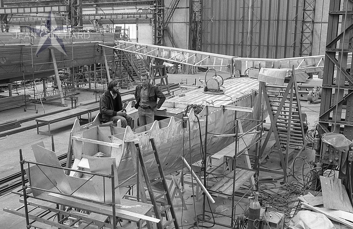French sailor Eric Tabarly's boat, the Paul Ricard, first hydrofoil sailing boat, under construction at Cherbourg Naval Shipyard.