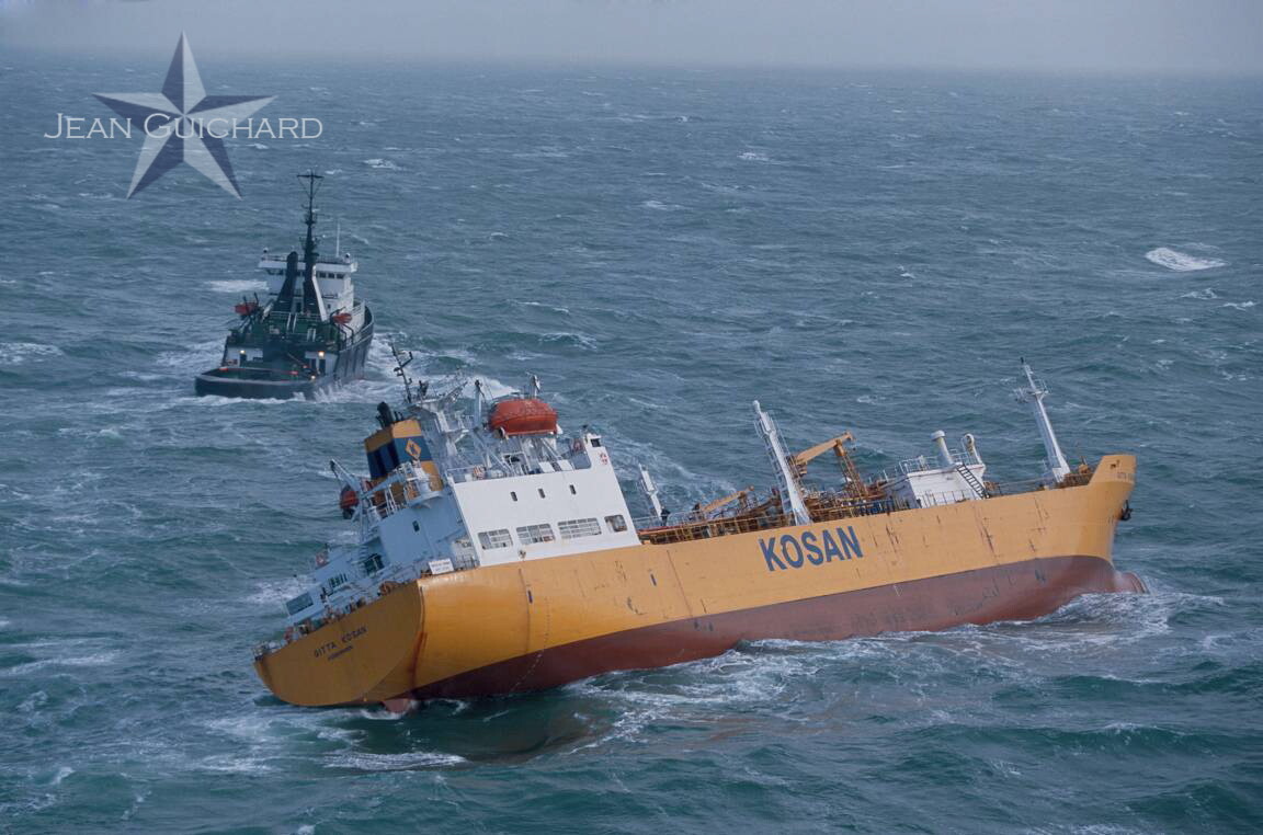 The deep sea tugboat Abeille Flandre during a rescue operation, on the route of Fromveur near Ouessant during high wind.