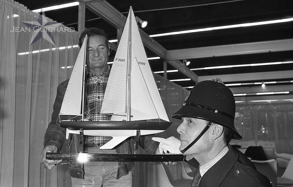 Navigator Eric Tabarly receive the first model of Pen Duick 6 at a toy show in Paris. The bobby show the problematic keel.