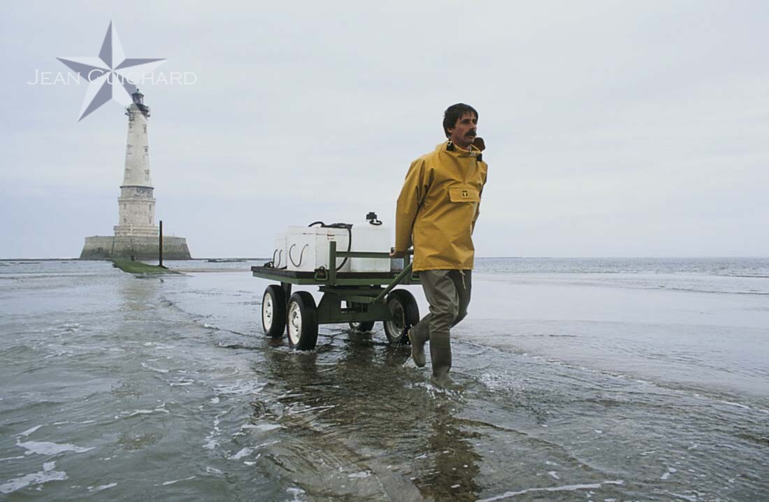 Lighthouse of Cordouan in the setting sun. Erected between 1548 and 1611, it is the oldest lighthouse in service in France. Situated in the mouth of the Gironde, on a sandbank which was formerly an island; Augustine Fresnel, inventor of the famous optic which equips almost every lighthouse in the world, installed the first model there in 1823. Situated near Bordeaux, nicknamed the king of lighthouses and lighthouse of kings. See P 125, 106, of the book Enfers et Paradis, P 104 of the book Tous les phares de France; P 16, P 180 of the book phares de l'Atlantique nord.