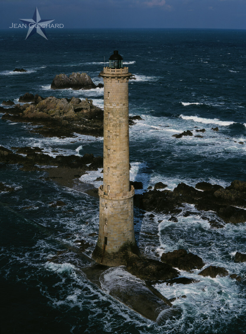 Lighthouse of Héaux-de-Bréhat, built by Léond Reynaud. Partially destroyed by the German army in August 1944. See P 43 of the book Tous les phares de France. Situated on the reefs of porphyry Les épées de Tréguier, near the island of Bréhat, off the pink granite coast.