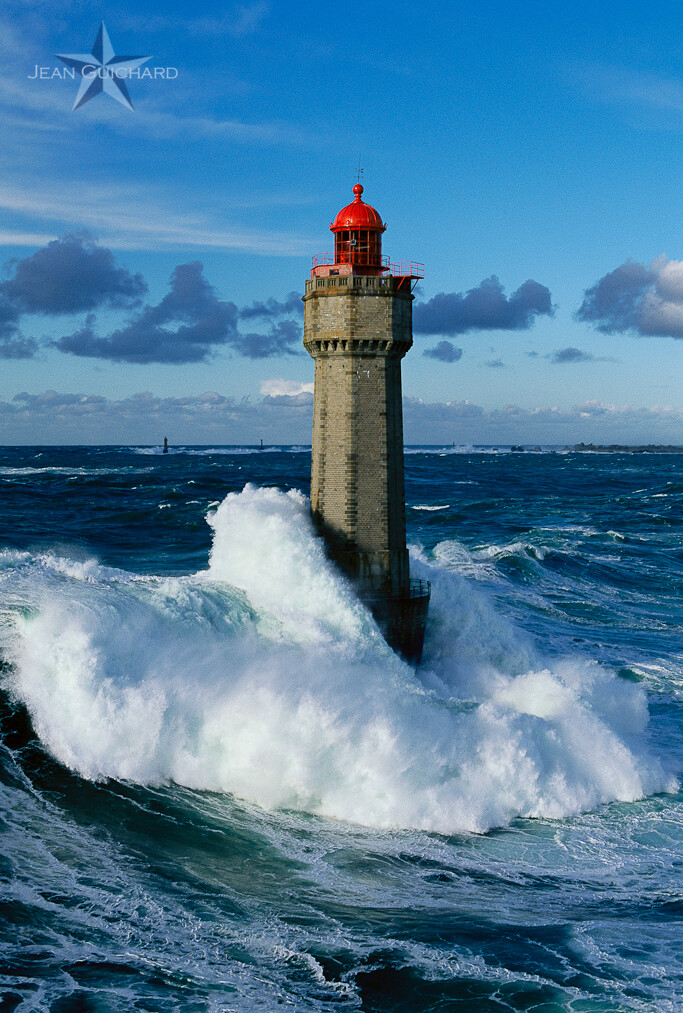See p 58 of the book Tous les phares de France. Lighthouse of "la Jument" , in the storm. Erected on a stone called la Jument, "Ar-Gazec" in breton. Route of Fromveur near the island of Ouessant,