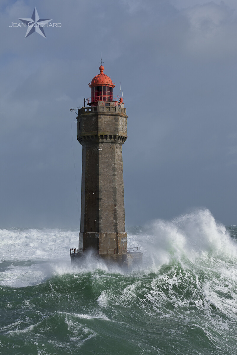 Lighthouse of La Jument, situated in Iroise Sea, during the storm Qumeira