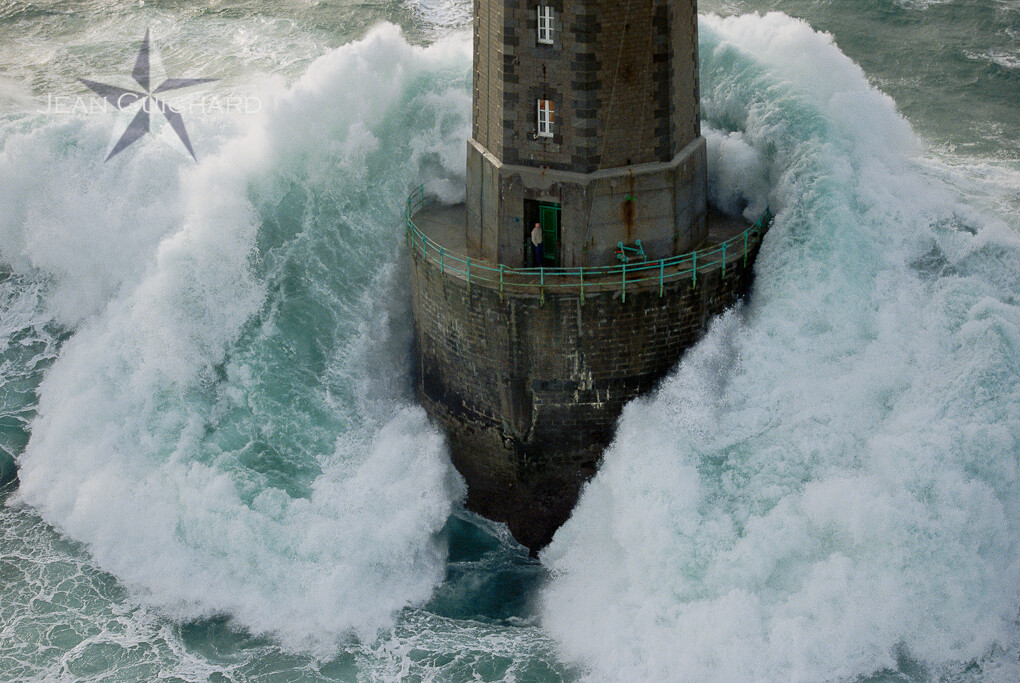 See p 58 of the book Tous les phares de France. Lighthouse of "la Jument" and the guard Theodore Malgorne, in the storm. Erected on a stone called la Jument, "Ar-Gazec" in breton. Route