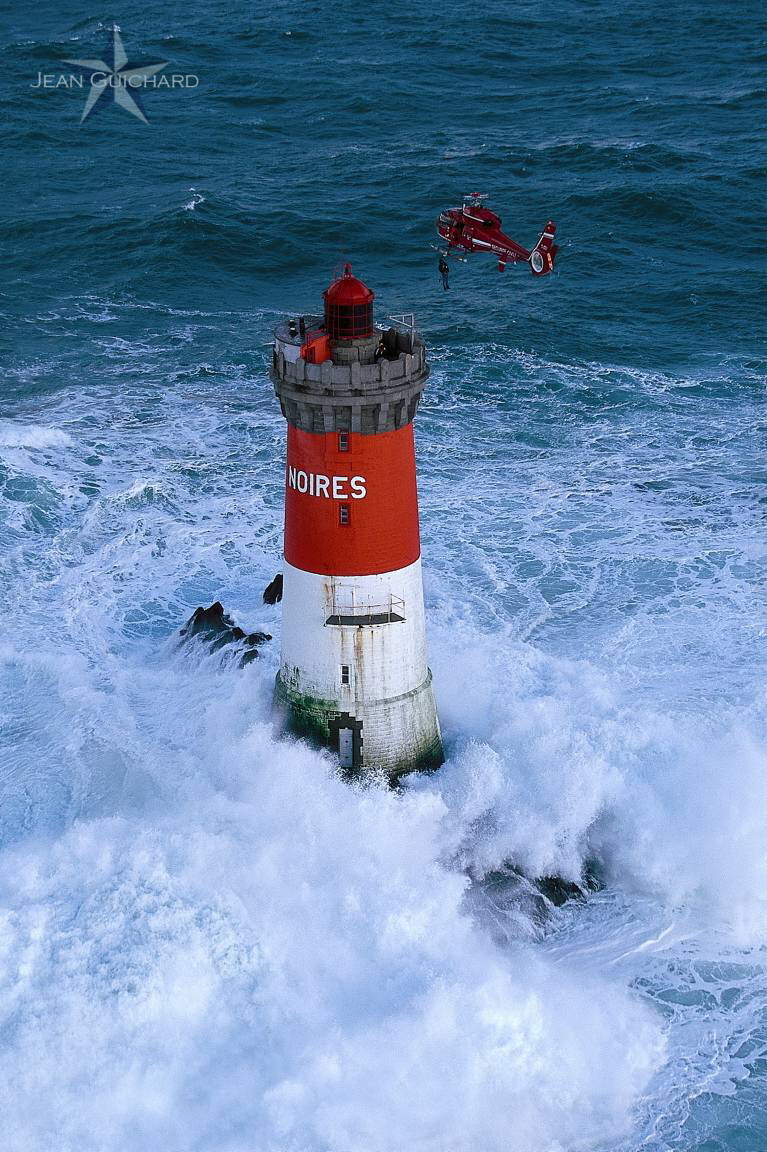 Lighthouse of Les Pierres-noires. A technician of maintenance at the service of lighthouses and beacons is being winched up by a helicopter of the civil security.