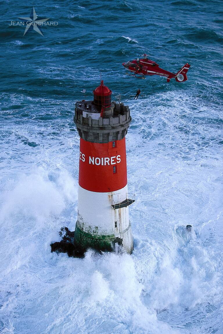 Lighthouse of Les Pierres-noires. A technician of maintenance at the service of lighthouses and beacons is being winched up by a helicopter of the civil security.