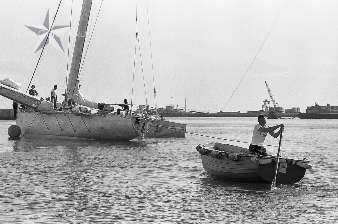 Préparatifs à la première sortie en mer du premier hydrofoil de course "Paul Ricard" conçu par Eric Tabarly.