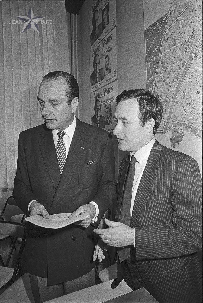 Présentation par Jacques Chirac des têtes de listes pour les élections municipales de la ville de Paris. Jean Tiberi, Jacques Toubon, Bernard Pons, Maurice Couve de Murvile, Nicole de Hautcloque, Jacques Dominati, Alain Juppé. Ici Jacques Chirac et Jean Tiberi.