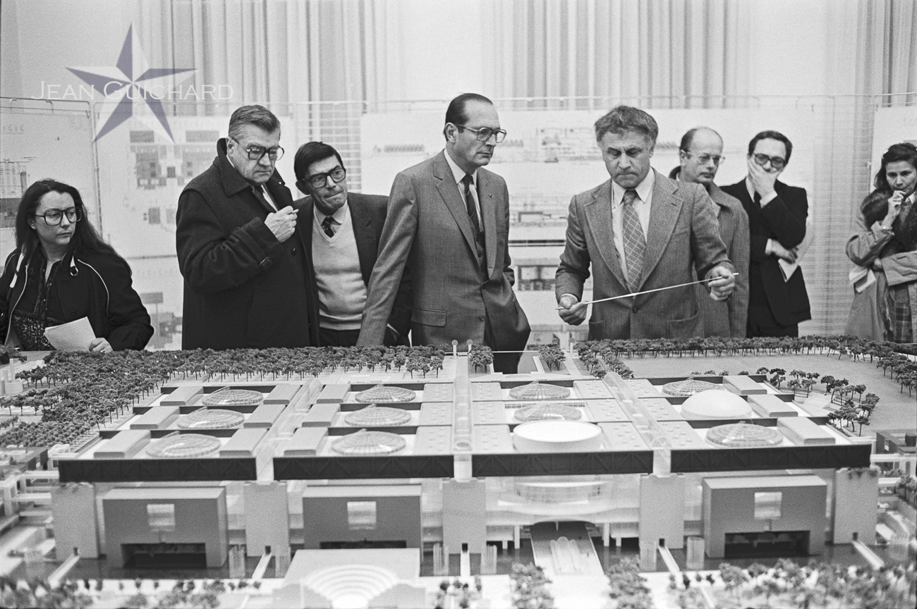 Jacques Chirac, Maire de Paris, visite le chantier de démolition des anciens abattoirs de La Vilette en compagnie du président Paul Delouvrier et de l'architecte du nouveau musée des sciences Adrien Fainsilber