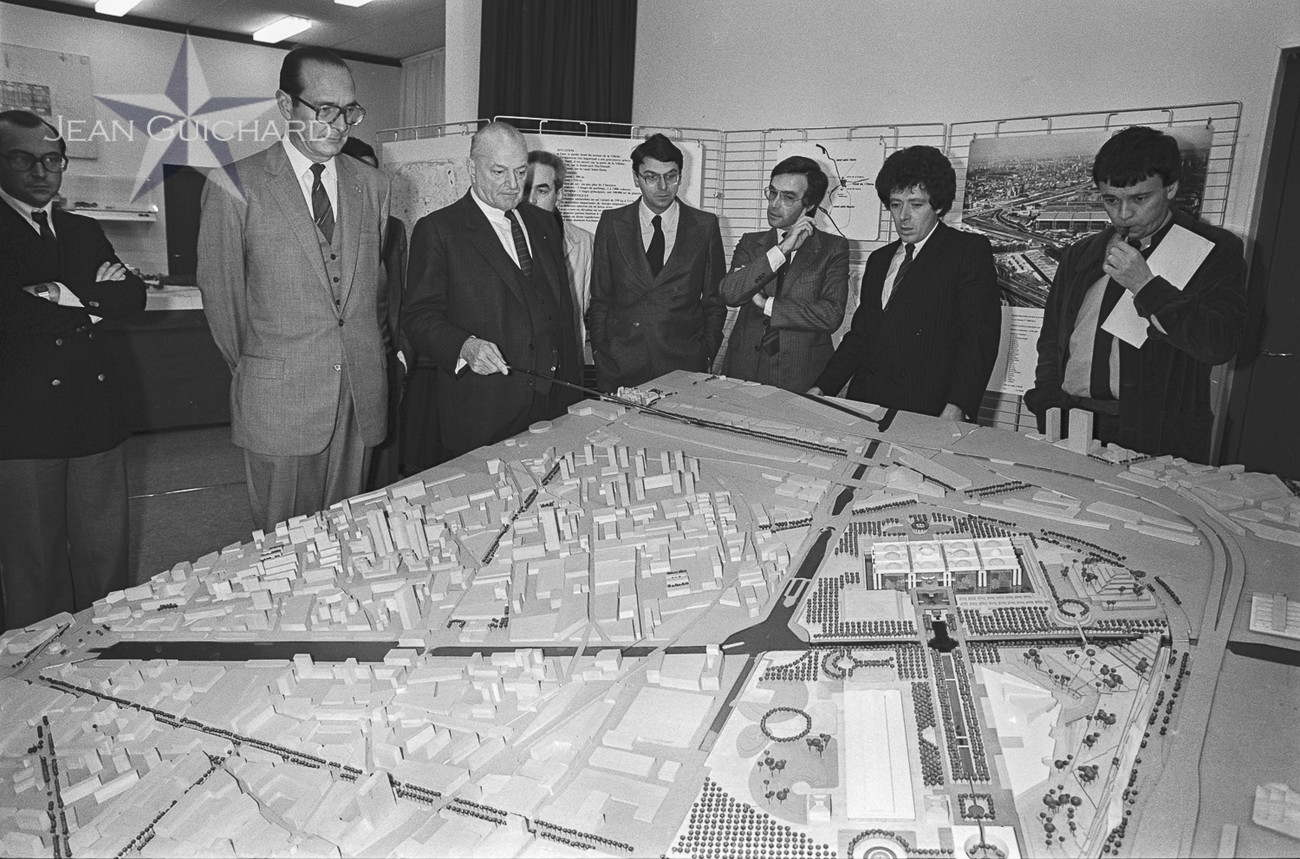 Jacques Chirac, Maire de Paris, visite le chantier de démolition des anciens abattoirs de La Vilette en compagnie du président Paul Delouvrier et de l'architecte du nouveau musée des sciences Adrien Fainsilber