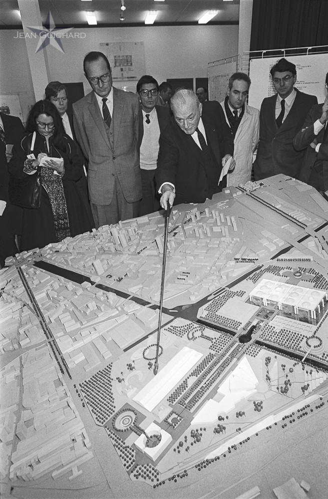 Jacques Chirac, Maire de Paris, visite le chantier de démolition des anciens abattoirs de La Vilette en compagnie du président Paul Delouvrier et de l'architecte du nouveau musée des sciences Adrien Fainsilber