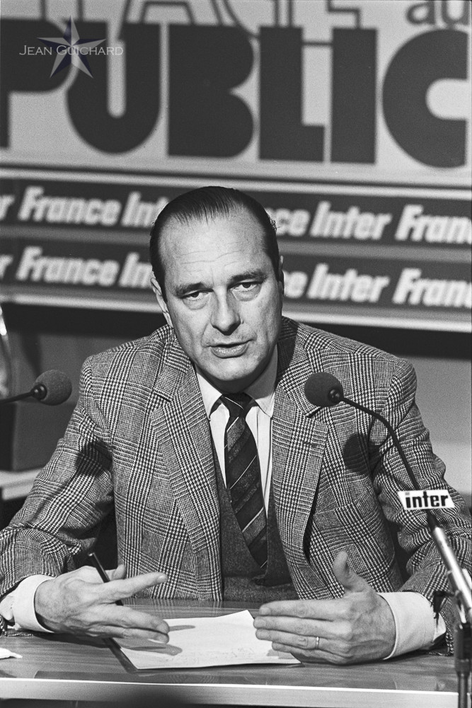 Jacques Chirac lors de l'émission de France Inter "Face au public" et Michèle Cotta Présidente de Radio France