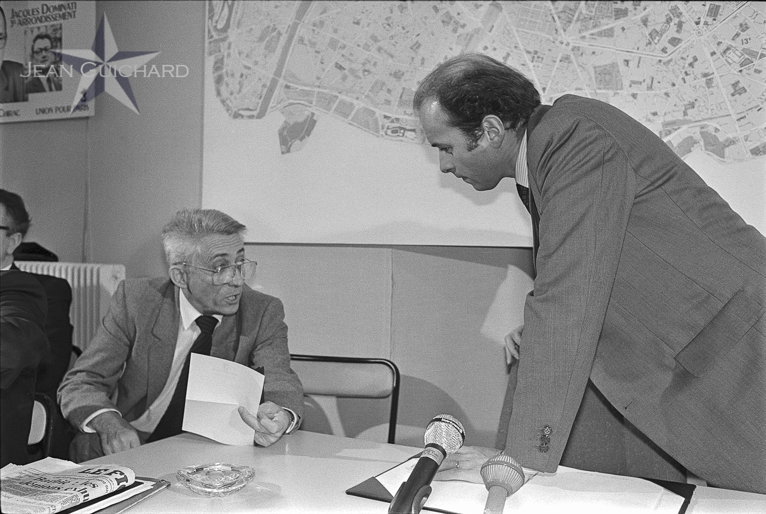 Présentation par Jacques Chirac des têtes de listes pour les élections municipales de la ville de Paris. Jean Tiberi, Jacques Toubon, Bernard Pons, Maurice Couve de Murvile, Nicole de Hautcloque, Jacques Dominati, Alain Juppé. À gauche Bernard Pons, à droite Jacques Toubon.