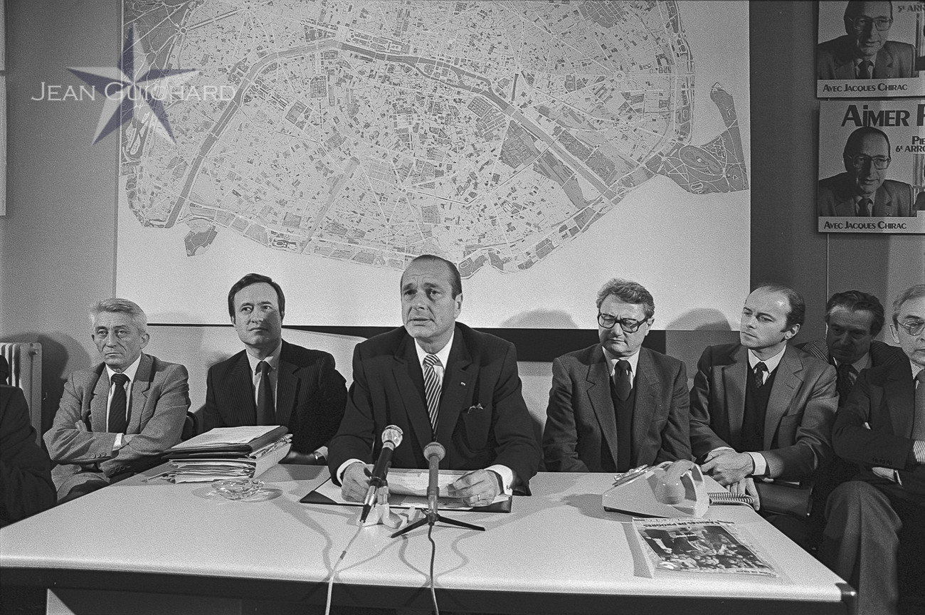 Présentation par Jacques Chirac des têtes de listes pour les élections municipales de la ville de Paris. Jean Tiberi, Jacques Toubon, Bernard Pons, Maurice Couve de Murvile, Nicole de Hautcloque, Jacques Dominati, Alain Juppé