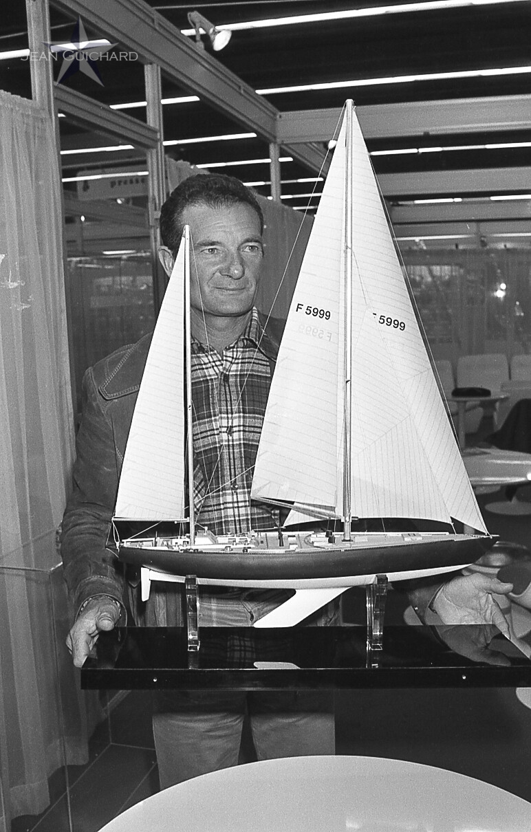 Le Navigateur Eric Tabarly reçoit la première maquette de Pen Duick 6 au salon du jouet.