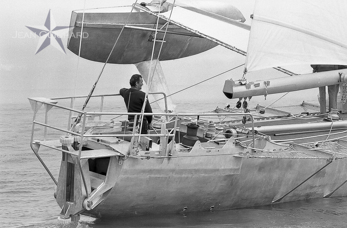 Préparatifs à la première sortie en mer du premier hydrofoil de course "Paul Ricard" conçu par Eric Tabarly.