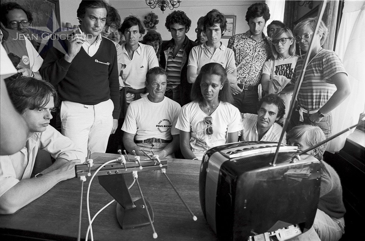 record Charlie Barr, arrivée à la Trinité-sur-mer, Eric Tabarly et Jacqueline tabarly regarde le film de la traversée réalisé par Dominique Pipa. Dans les spectateurs: Patrick de Carolis, Francis Apesteguy.
