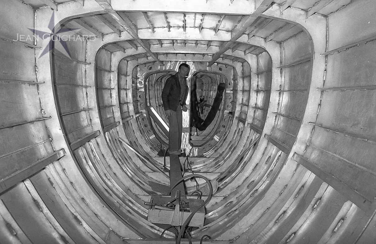 Eric Tabarly et Marc Pajot, lors d'une petite fête organisée au chantier naval CMN à Cherbourg pour féter l'achèvement de la coque du premier voilier à hydrofoil "Paul Ricard"