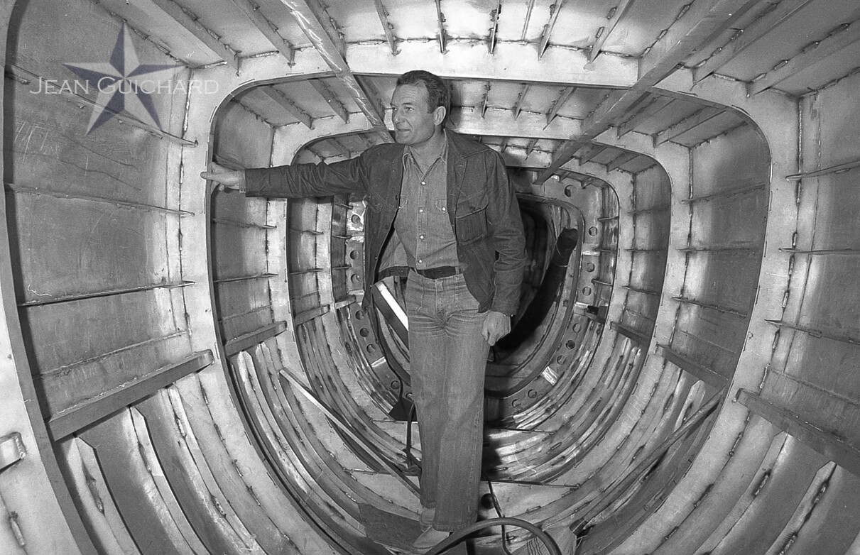 Eric Tabarly et Marc Pajot, lors d'une petite fête organisée au chantier naval CMN à Cherbourg pour féter l'achèvement de la coque du premier voilier à hydrofoil "Paul Ricard"