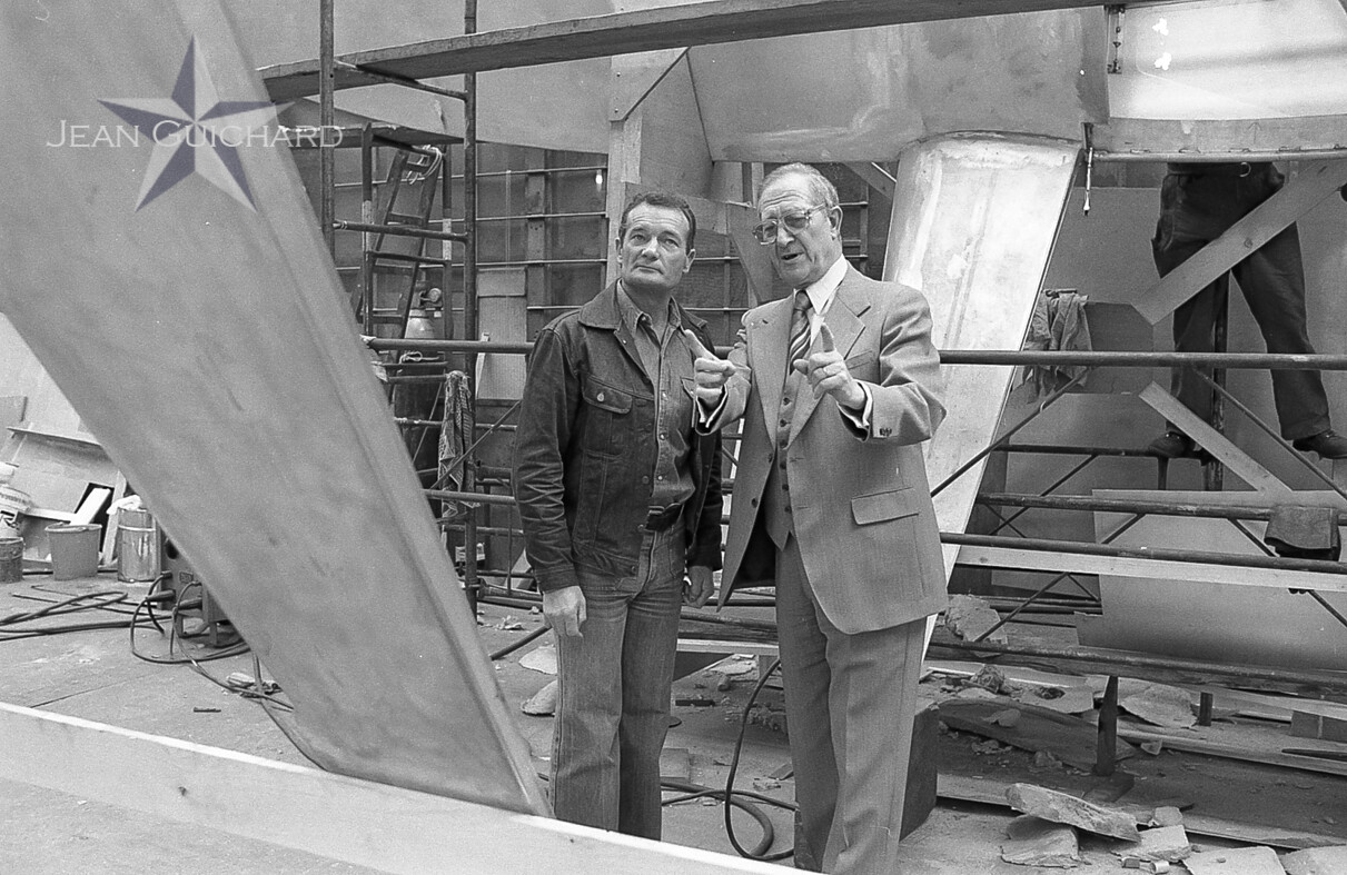 Eric Tabarly , chantier naval CMN à Cherbourg pour féter l'achèvement de la coque du premier voilier à hydrofoil "Paul Ricard", ici avec M. Laurent, directeur de la CMN.