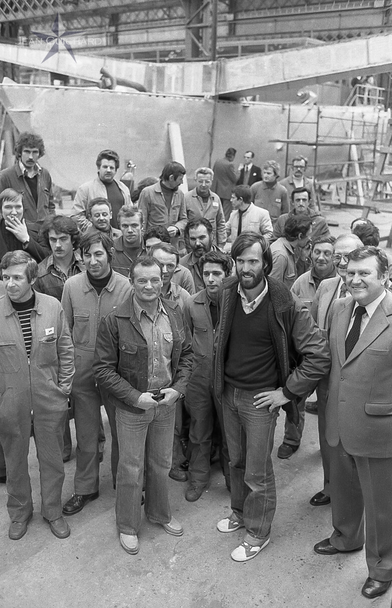 Eric Tabarly et Marc Pajot, lors d'une petite fête organisée au chantier naval CMN à Cherbourg pour féter l'achèvement de la coque du premier voilier à hydrofoil "Paul Ricard"