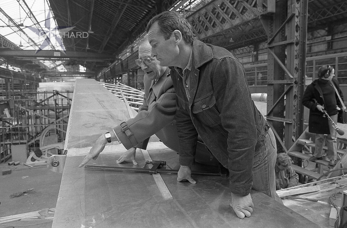 Eric Tabarly et Marc Pajot, lors d'une petite fête organisée au chantier naval CMN à Cherbourg pour féter l'achèvement de la coque du premier voilier à hydrofoil "Paul Ricard"