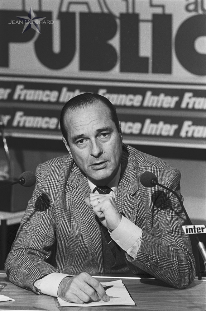 Jacques Chirac lors de l'émission de France Inter "Face au public" et Michèle Cotta Présidente de Radio France
