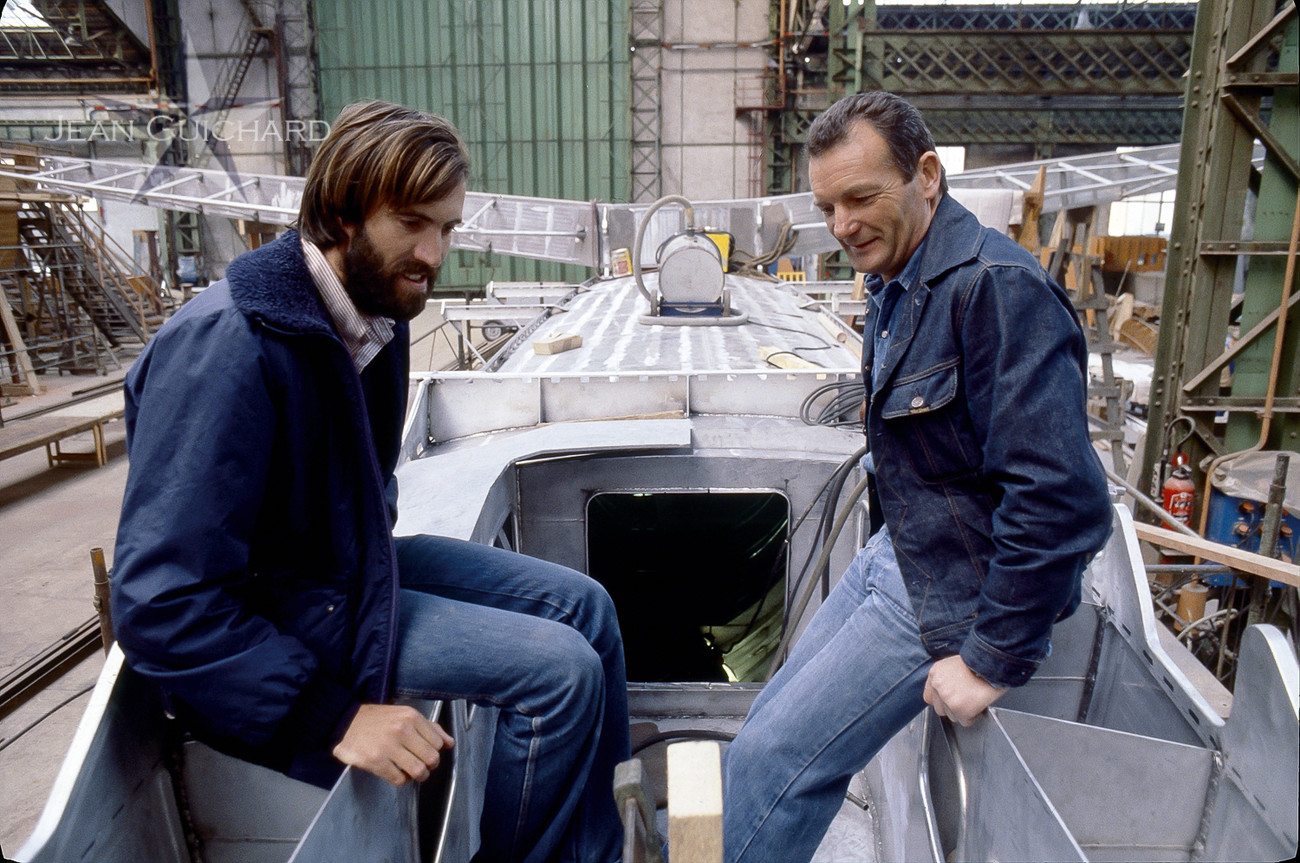 Construction du Paul Ricard à la CMN de Cherbourg.Marc Pajot et Eric Tabarly dans le cokpit de l'hydrofoil.