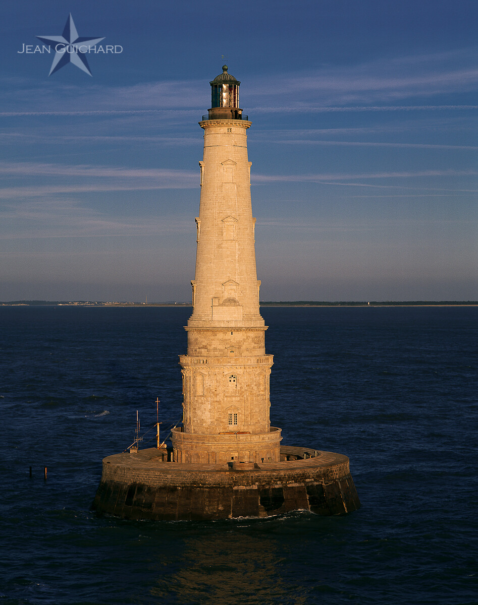 Phare de Cordouan au soleil couchant. Erigé entre 1548 et 1611, il est le plus ancien phare en activité en France. Situé dans l'embouchure de la Gironde, sur un banc de sable qui était autrefois une île. Augustin Fresnel, inventeur de la fameuse optique qui équipe presque tous les phares dans le monde, y installa le premier modèle en 1823.