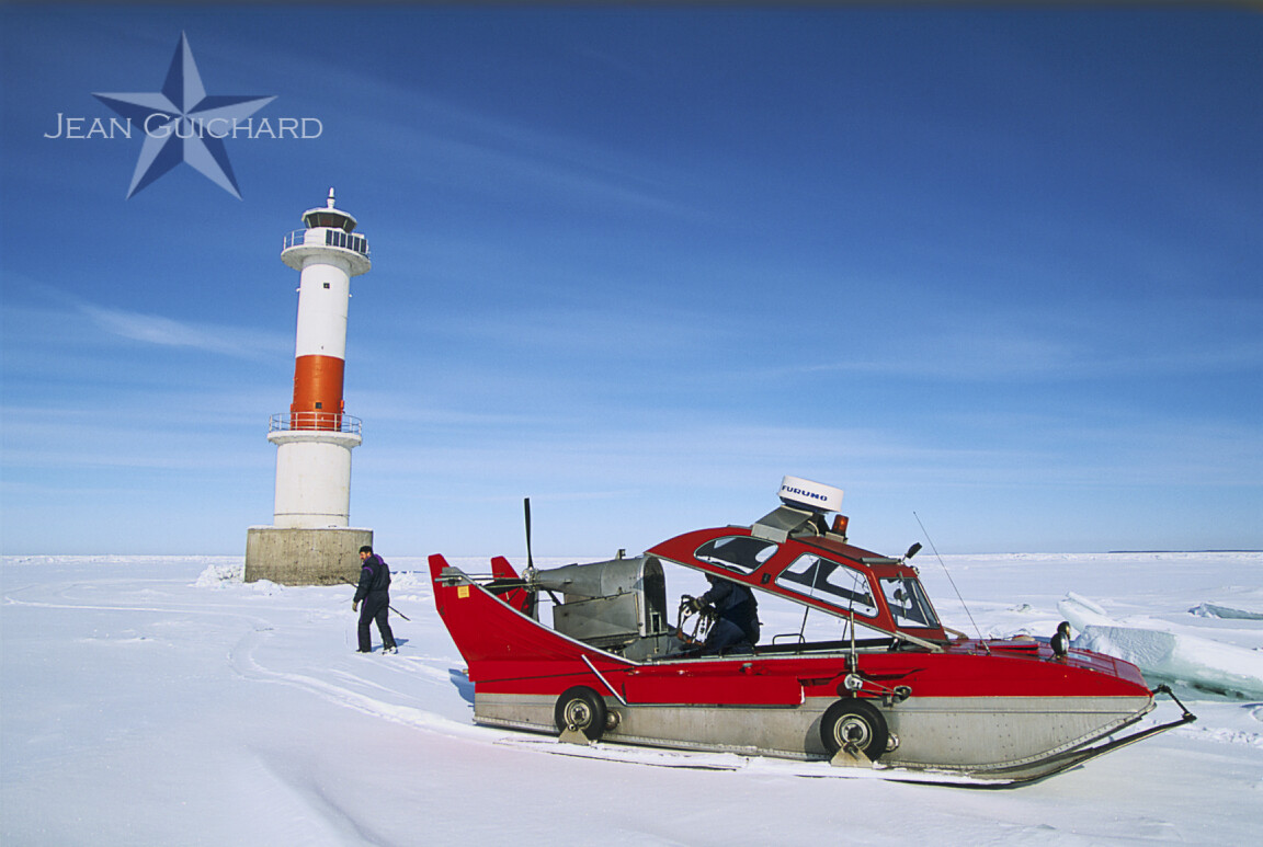 C'est un engin étrange, mi-bateau mi-traineau mû» par une hélice d'avion, ce qui lui permet de se déplacer sur la glace et de franchir les canaux d'eau libre tracés par les brise-glaces.