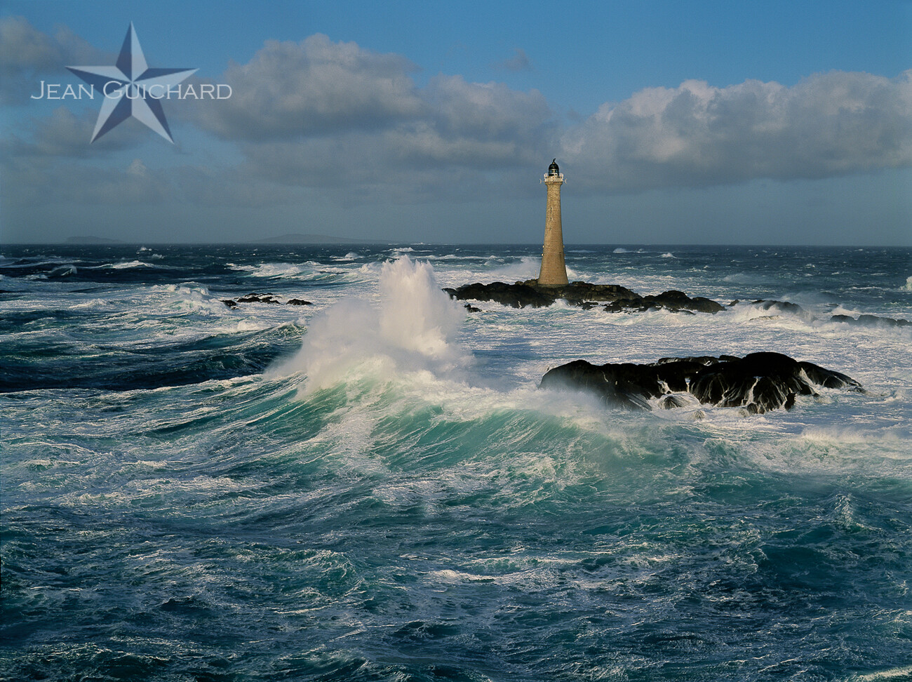 Phare de Skerryvore lors d'un coup de vent. Situe à 40 km à l'ouest de Mull, au sud de l'île de Tiree et de la mer des Hébrides.